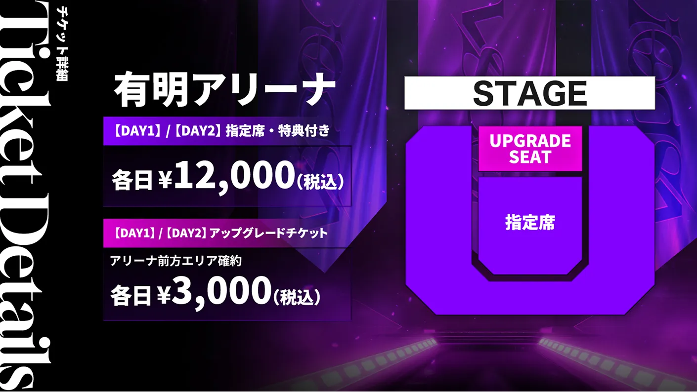 【DAY1】アップグレードチケット ¥3,000(税込) 【DAY2】アップグレードチケット ¥3,000(税込) <特典内容> アリーナ 前方エリア席 確約 |