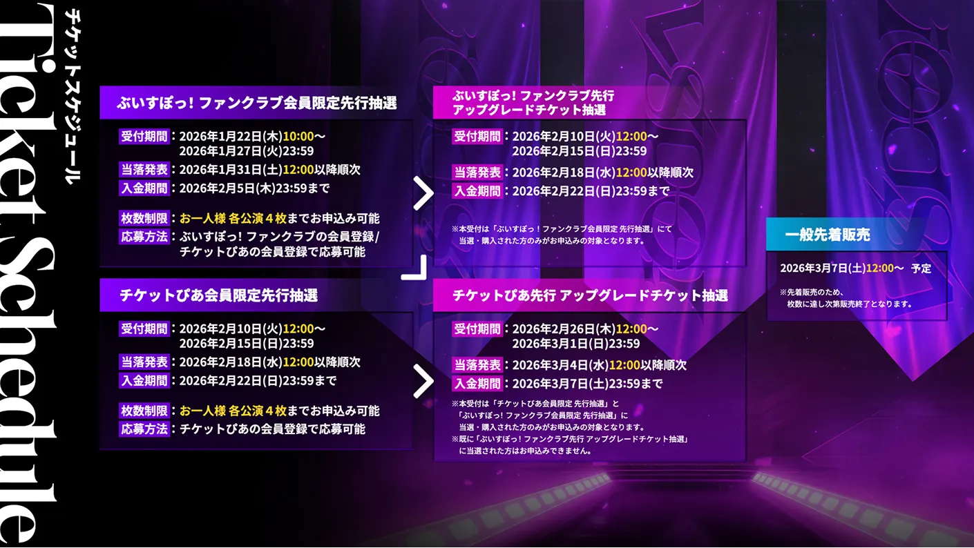 申込みページ:https://fc.vspo.jp/ 受付期間:2026年1月22日(木)10:00〜2026年1月27日(火)23:59 当落発表:2026年1月31日(木)12:00以降順次 入金期間:2026年2月5日(木)23:59まで 枚数制限:お一人様 各公演4枚までお申込み可能 応募方法:ぶいすぽっ!ファンクラブの会員登録/チケットぴあの会員登録で応募可能 ※本受付はファンクラブ会員限定の先行抽選となります。 ※本受付は同行者分のお申込みをされる場合、同行者の「氏名・電話番号・ファンクラブ会員ID」の入力が必要となります。 ※受付期間終了後の内容の変更・修正・キャンセルは一切できません。 ※申込者と同行者を入れ替えてお申込みいただくことは可能ですが、同一公演において「氏名・電話番号・ファンクラブ会員ID」同一の方が重複して当選することはありません。 ※同行者分のチケットは、お申込み時に入力された「氏名・電話番号・ファンクラブ会員ID」がすべて一致する方のみ分配・利用が可能です。 ※ファンクラブ会員IDが正しくても、お申込み時に入力した氏名または電話番号に誤りがある場合は、チケットの分配はできません。 ※入力情報の誤りによる分配不可・入場不可について、主催者およびプレイガイドは責任を負いかねます。 ※入力内容の誤りを含む、いかなる理由においてもご購入後の払い戻しは一切お受けできませんので、入力間違いのないよう十分ご注意ください。 |