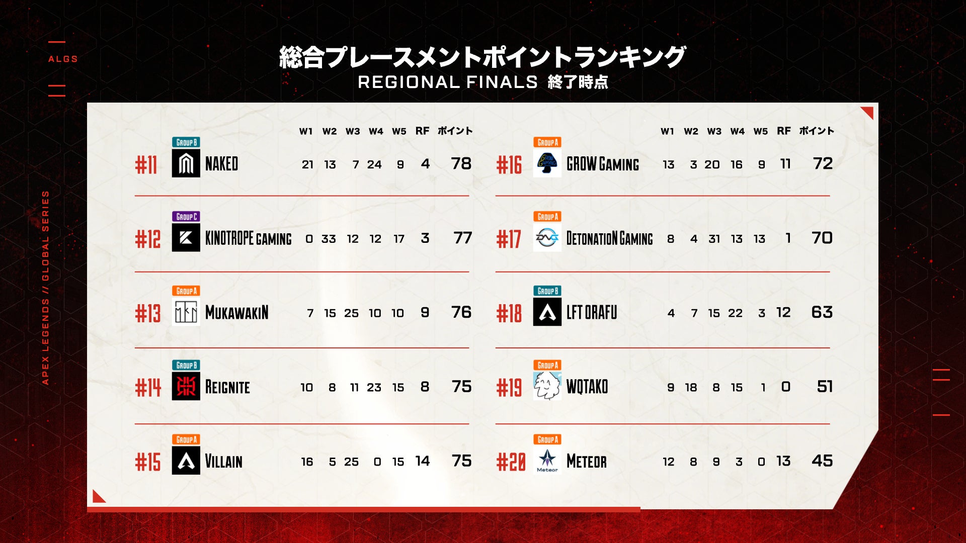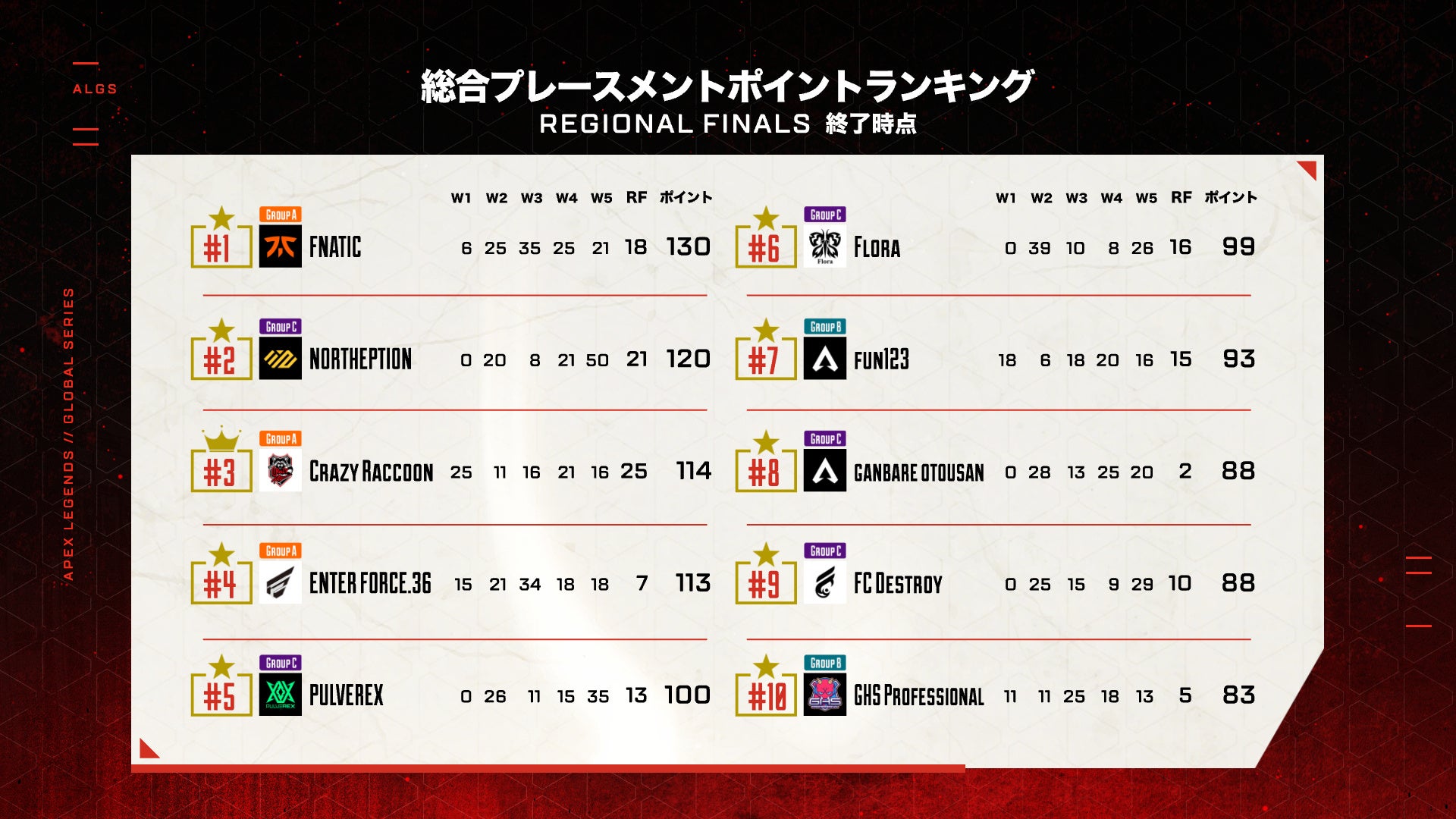 リージョンファイナルはマッチポイント方式。各試合での順位ポイントやキルポイントの合計が50ポイントを超えたチームはマッチポイントとなり、マッチポイント到達以降の試合でチャンピオンになったチームが優勝というルールです。