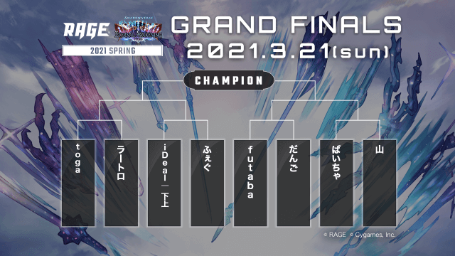 RAGE Shadowverse 2021 Spring いよいよ頂点が決まる! GRAND FINALS 開催! 大会結果 生配信 出演者 開催概要 ファイナリスト toga ラートロ iDeal|下上 ふぇぐ futaba だんご ばいちゃ 山 ツイート シェア 送る