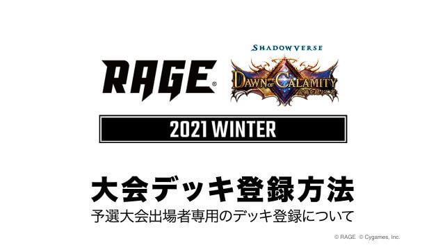 デッキ登録期間になっても大会デッキ登録ボタンが表示されない場合は、必ず「お問い合わせ期限」までに「件名:大会デッキ登録について」と記載していただき、「contact@rage-esports-operation.jp」へご連絡ください。