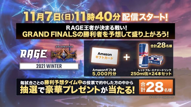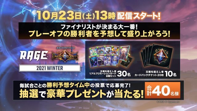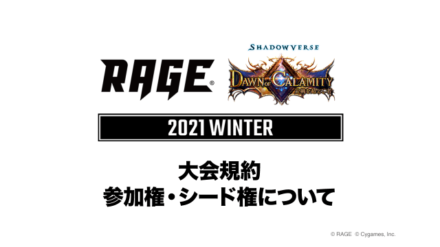 キャンペーン2021 WinterRAGE運営事務局でございます。 「RAGE Shadowverse 2021 Winter」1次予選 開催を記念してTwitterフォロー&リツイートキャンペーンを実施中です。 RAGE公式...