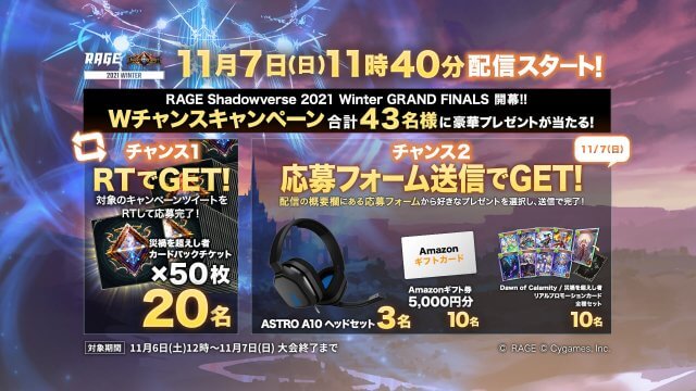 キャンペーン2021 WinterRAGE運営事務局でございます。 「RAGE Shadowverse 2021 Winter」2次予選の実施を記念いたしまして、Twitterフォロー&リツイートで豪華プレゼントが当たるキャン...