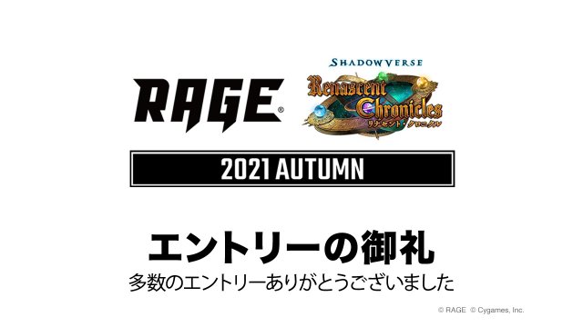 キャンペーン2021 AutumnRAGE運営事務局でございます。 「RAGE Shadowverse 2021 Autumn」2次予選の実施を記念いたしまして、Twitterフォロー&リツイートで豪華プレゼントが当たるキャン...