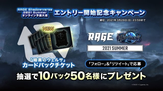 新着情報 「オンライン予選」エントリー開始記念キャンペーン!フォロー&リツイートで抽選で50名様に賞品が当たる! 2021.3.21キャンペーン2021 Summer RAGE運営事務局でございます。 「RAGE Shadowverse 2021 Summer」エントリー開催を記念してTwitterフォロー&リツイートキャンペーンを実施中です。 RAGE公式... 「RAGE Shadowverse 2021 Summer」大会情報発表!エントリー受付開始!締切は4月25日(日)23:59まで! 2021.3.21お知らせ予選大会エントリー2021 Summer 「RAGE Shadowverse 2021 Summer」の詳細情報の発表、およびエントリー受付を開始しました! ▼大会について ▼賞金について ▼参加賞について エントリー期間は3月21日(日)〜... 1 2