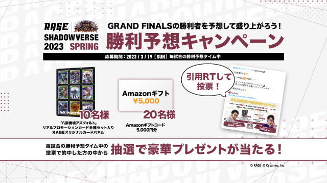 キャンペーンRAGE運営事務局でございます。 「RAGE Shadowverse 2023 Spring」予選プレーオフ 開催を記念してTwitterフォロー&リツイートキャンペーンを実施中です。 RAG...