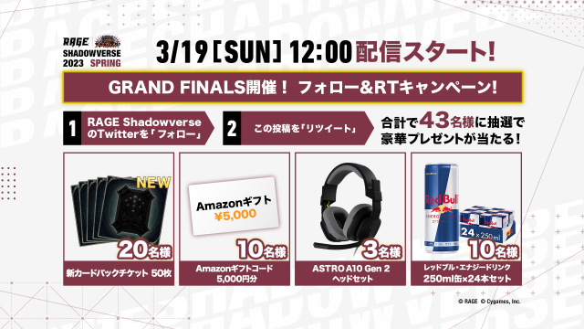 キャンペーンRAGE運営事務局でございます。 「RAGE Shadowverse 2023 Spring」GRAND FINALS 開催を記念してTwitterフォロー&リツイートキャンペーンを実施中です...