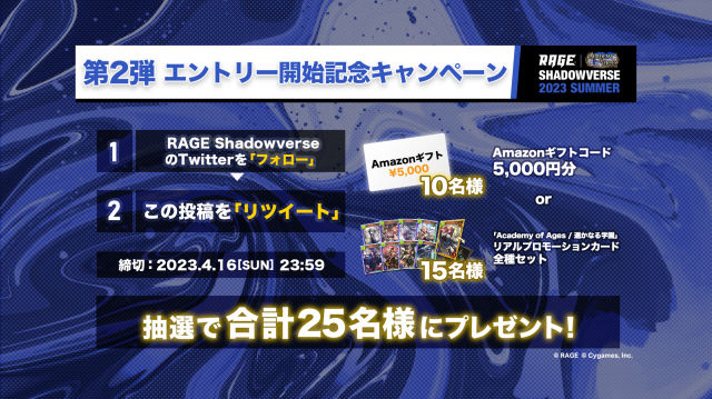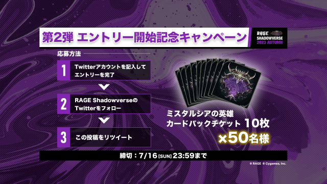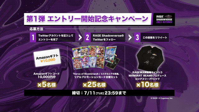 キャンペーンRAGE運営事務局でございます。 「RAGE Shadowverse 2023 Summer」2次エントリー開始を記念してTwitterフォロー&リツイートキャンペーンを実施中です。 RAGE...