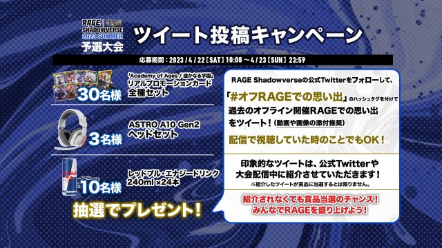 キャンペーンRAGE運営事務局でございます。 「RAGE Shadowverse 2023 Summer」予選大会 開催を記念してTwitterフォロー&リツイートキャンペーンを実施中です。 RAGE S...