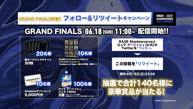 キャンペーンRAGE運営事務局でございます。 「RAGE Shadowverse 2023 Summer」GRAND FINALS 開催を記念してTwitterフォロー&リツイートキャンペーンを実施中です...