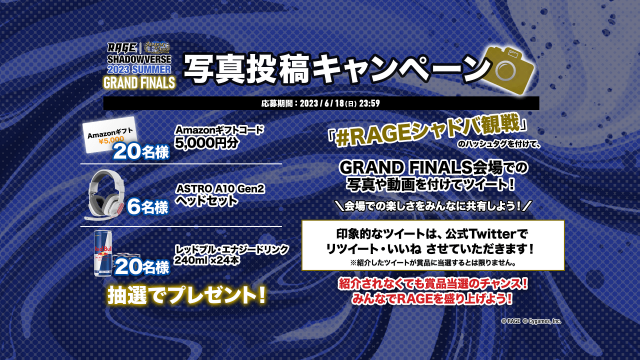 #RAGEシャドバ観戦「GRAND FINALS」写真投稿キャンペーン! RAGE公式Twitterフォローと指定のハッシュタグを付けて写真付きツイートを投稿!抽選で46名様に賞品が当たる!