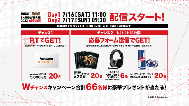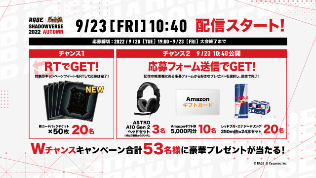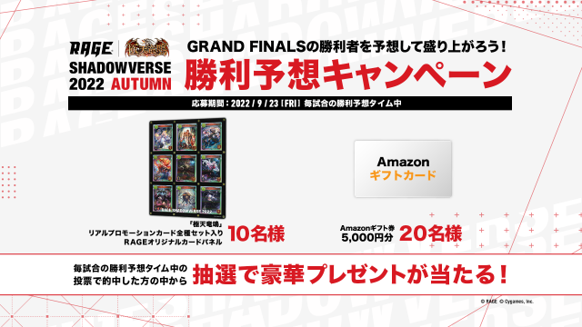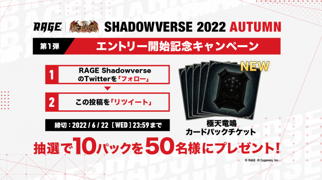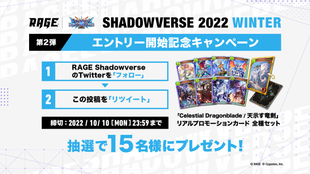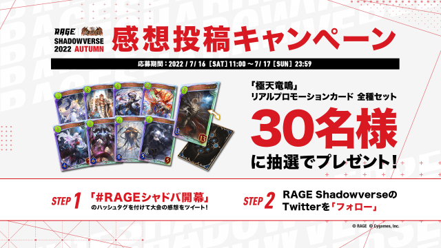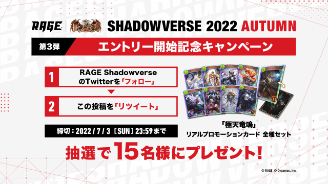 2022 Autumn 予選大会 Twitter投稿キャンペーン!」RAGE Shadowverse公式Twitterフォローと指定のハッシュタグを付けて感想ツイートを投稿!抽選で30名様に賞品が当たる!