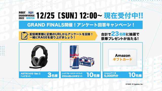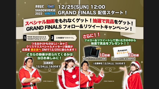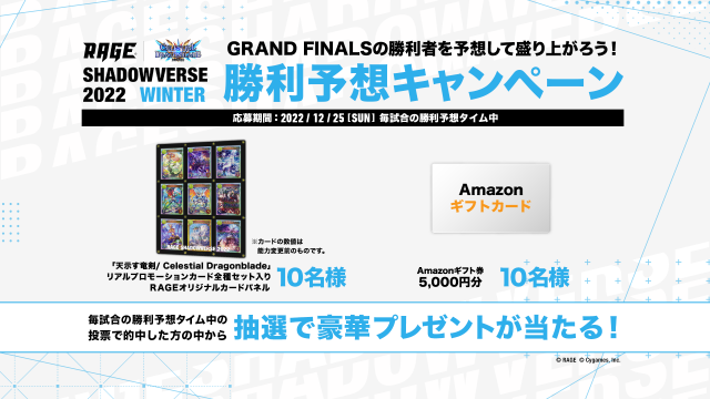 キャンペーン2022 WinterRAGE運営事務局でございます。 「RAGE Shadowverse 2022 Winter」2次予選 開催を記念してTwitterフォロー&リツイートキャンペーンを実施中です。 RAGE S...
