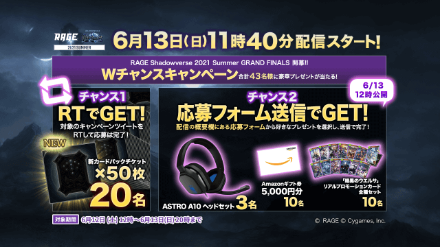 キャンペーン2021 AutumnRAGE運営事務局でございます。 「RAGE Shadowverse 2021 Autumn」オンライン予選 プレーオフの開催を記念いたしまして、Twitterフォロー&リツイートで豪華プレゼ...