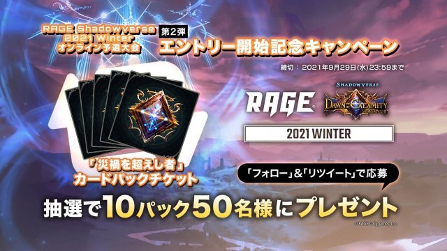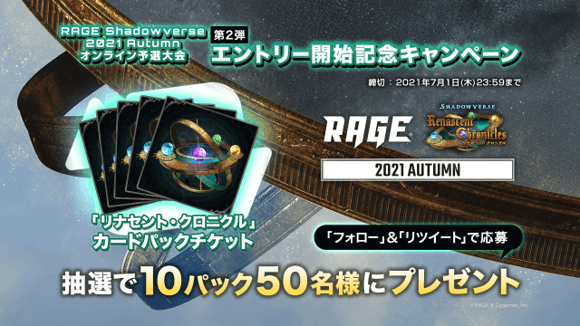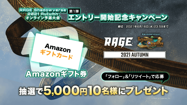 キャンペーン2021 AutumnRAGE運営事務局でございます。 「RAGE Shadowverse 2021 Autumn」エントリー開催を記念してTwitterフォロー&リツイートキャンペーンを実施中です。 RAGE公式...