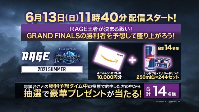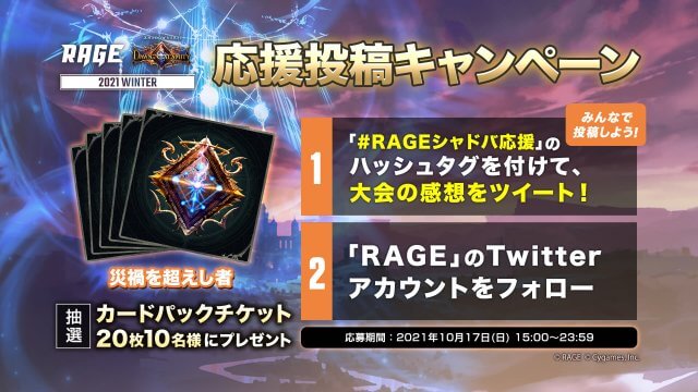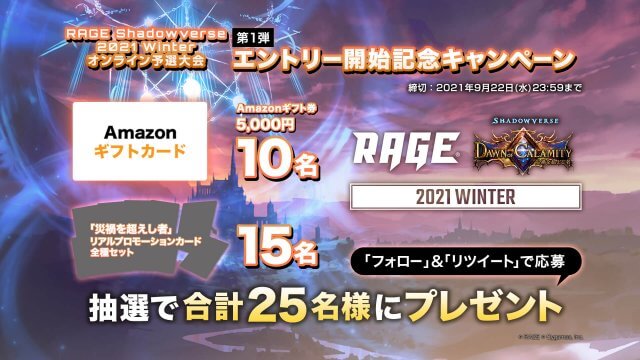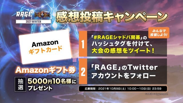キャンペーン2021 WinterRAGE運営事務局でございます。 「RAGE Shadowverse 2021 Winter」1次予選 開催を記念してTwitterフォロー&リツイートキャンペーンを実施中です。 RAGE公式...