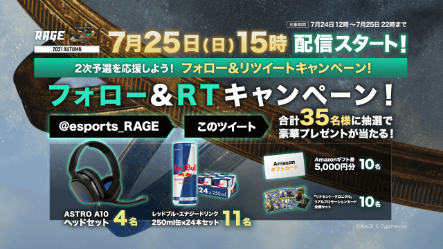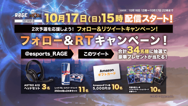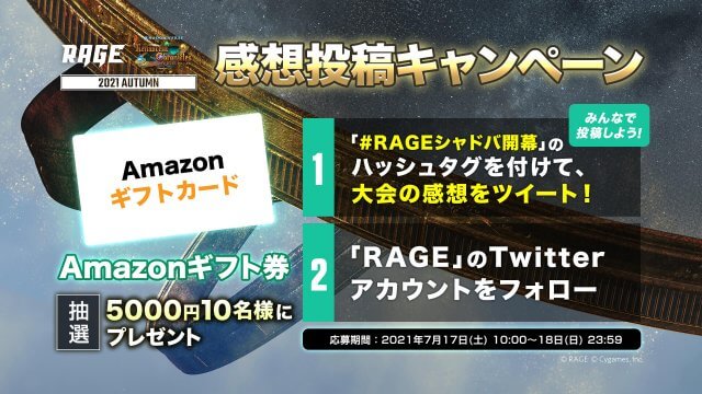 「オンライン予選」1次予選 Twitter投稿キャンペーン!」RAGE公式Twitterフォローと指定のハッシュタグを付けて感想ツイートを投稿!抽選で10名様に賞品が当たる!