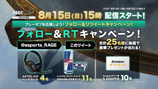 キャンペーン2021 AutumnRAGE運営事務局でございます。 「RAGE Shadowverse 2021 Autumn」2次予選の実施を記念いたしまして、Twitterフォロー&リツイートで豪華プレゼントが当たるキャン...