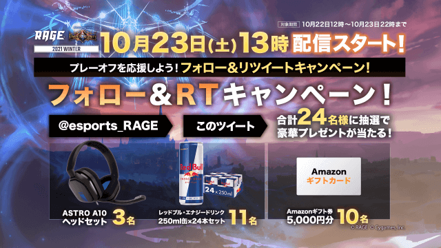 キャンペーン2021 WinterRAGE運営事務局でございます。 「RAGE Shadowverse 2021 Winter」2次予選の実施を記念いたしまして、Twitterフォロー&リツイートで豪華プレゼントが当たるキャン...