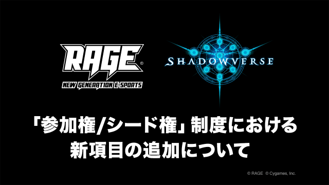 新着情報 RAGE Shadowverse がギネス世界記録™達成! 2020.1.25お知らせ予選大会2020 Spring RAGE運営事務局でございます。 本日開催されました、「RAGE Shadowverse 2020 Spring バトルフェスティバル」予選大会にてギネス世界記録を達成しました! 今回から中学生も参加... 本日から2日間!RAGE Shadowverse 2020 Spring バトルフェスティバル 予選大会を開催! 2020.1.25お知らせ予選大会2020 Spring RAGE運営事務局でございます。 本日より2日間にわたって、「RAGE Shadowverse 2020 Spring バトルフェスティバル」予選大会を、幕張メッセ 7.8ホールにて開幕いたします。 ... RAGE Shadowverse 2019 Winter 大会結果 および 全日程終了の御礼 2019.11.23お知らせ予選大会2019 Winter RAGE運営事務局でございます。 本日、幕張メッセにて開催いたしました「RAGE Shadowverse 2019 Winter」は、多くの皆様にご来場いただき、大盛況の中、無事終了いたしました。 ご... 「RAGE Shadowverse 2020 Spring」大会情報発表!エントリー受付開始!締切は1月8日(水)23:59まで! 2019.11.23お知らせ予選大会エントリー2020 Spring 「RAGE Shadowverse 2020 Spring」の詳細情報の発表、およびエントリー受付を開始しました! エントリー期間は11月23日(土)〜 1月8日(水)23:59までとなります。詳しく... ファイナリストデッキ公開!! RAGE 2019 Winter GRAND FINALS 2019.11.23お知らせGRAND FINALSファイナリスト2019 Winter RAGE運営事務局でございます。 RAGE 2019 Winter GRAND FINALS 全ファイナリストのデッキリストを公開いたしました。 デッキリストは各ファイナリストのプロフィールページをご... ファイナリスト予選大会使用デッキ(2) – koharu 選手、さわちゃん 選手、ヨシヒコ 選手、かけうどん 選手 2019.10.6お知らせ予選大会ファイナリスト2019 Winter RAGE運営事務局でございます。 予選大会を勝ち抜き、ファイナリストに決定した8名の使用デッキを公開! こちらでは、koharu 選手、さわちゃん 選手、ヨシヒコ 選手、かけうどん 選手 4名のデッキ... ファイナリスト予選大会使用デッキ(1) – DiCE|どんと 選手、Tatsuno 選手、かきく|EvK 選手、magnet 選手 2019.10.6お知らせ予選大会ファイナリスト2019 Winter RAGE運営事務局でございます。 予選大会を勝ち抜き、ファイナリストに決定した8名の使用デッキを公開! こちらでは、DiCE|どんと 選手、Tatsuno 選手、かきく|EvK 選手、magnet 選... ファイナリスト決定! トーナメント組み合わせ発表! 2019.10.6お知らせ予選大会ファイナリスト2019 Winter RAGE運営事務局でございます。 2日間にわたり行われました「RAGE Shadowverse 2019 Winter」予選大会は、多くの激戦を繰り広げ、大盛況の中、さきほど終了いたしました。 ご参加... 予選大会Day1終了! Day2から出場のシード選手をご紹介! 2019.10.5お知らせ予選大会2019 Winter RAGE運営事務局でございます。 RAGE Shadowverse 2019 Winter 予選大会 Day1が無事終了いたしました。 見事激戦を勝ち抜き、Day2に進出した選手は6,000名中約65... 本日から2日間!RAGE Shadowverse 2019 Winter予選大会を開催! 2019.10.5お知らせ予選大会2019 Winter RAGE運営事務局でございます。 本日より2日間にわたって、「RAGE Shadowverse 2019 Winter」予選大会が、幕張メッセ 4ホールにて開幕されます! 11/23(土)に行われる ... 「参加権/シード権」制度における新項目の追加について 2019.10.1お知らせ RAGE運営事務局です。 この度、RAGE Shadowverseでは、『2020 Spring』シーズンより新たな制度として『参加権(予選大会Day1の1~3回戦を不戦勝)』を追加いたします。 これ... RAGE Shadowverse 2019 Autumn 大会結果 および 全日程終了の御礼 2019.9.24お知らせ予選大会2019 Autumn RAGE運営事務局でございます。 本日、秋葉原UDXにて開催いたしました「RAGE Shadowverse 2019 Autumn」は、多くの皆様にご来場いただき、大盛況の中、無事終了いたしました。 ... ファイナリストデッキ公開!! RAGE 2019 Autumn GRAND FINALS 2019.9.21お知らせGRAND FINALSファイナリスト2019 Autumn RAGE運営事務局でございます。 RAGE 2019 Autumn GRAND FINALS 全ファイナリストのデッキリストを公開いたしました。 デッキリストは各ファイナリストのプロフィールページをご... 本日開催!RAGE Shadowverse 2019 Autumn GRAND FINALS! 2019.9.21お知らせGRAND FINALS2019 Autumn RAGE運営事務局でございます。 RAGE Shadowverse 2019 Autumn GRAND FINALS いよいよ本日 9/21(日)秋葉原UDX にて開催です! 大規模大会決勝戦の他、サ... エントリーの御礼と参加抽選について 2019.9.10お知らせエントリー2019 Winter RAGE運営事務局でございます。 2019年8月26日(月)より行っておりました「RAGE Shadowverse 2019 Winter」のエントリー受付は、予定通り9月9日(月)23:59をもって... 「RAGE Shadowverse 2019 Winter」大会情報発表!エントリー受付開始!締切は9月9日(月)23:59まで! 2019.8.26お知らせ予選大会エントリー2019 Winter 「RAGE Shadowverse 2019 Winter」の詳細情報の発表、およびエントリー受付を開始しました! エントリー期間は8月26日(月)~9月9日(月)23:59までとなります。詳しくはこ... RAGE Shadowverse 2019 Winter 国外選手向け大会エントリー開始のお知らせ 2019.8.19お知らせエントリー2019 Winter RAGE運営事務局でございます。 本日より、RAGE Shadowverse 2019 Winter 日本
