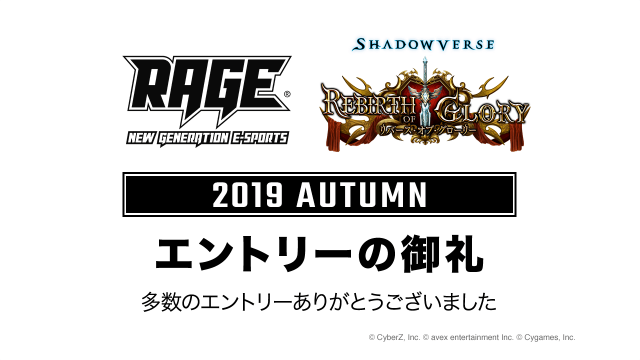 新着情報 予選大会Day1終了! Day2から出場のシード選手をご紹介! 2019.7.20お知らせ予選大会2019 Autumn RAGE運営事務局でございます。 RAGE Shadowverse 2019 Autumn 予選大会 Day1が無事終了いたしました。 見事激戦を勝ち抜き、Day2に進出した選手は6,000名中約65... 本日から2日間!RAGE Shadowverse 2019 Autumn予選大会を開催! 2019.7.20お知らせ予選大会2019 Autumn RAGE運営事務局でございます。 本日より2日間にわたって、「RAGE Shadowverse 2019 Autumn」予選大会が、幕張メッセ 3ホールにて開幕されます! 9/21(土)に行われる G... エントリーの御礼と参加抽選について 2019.7.2お知らせエントリー2019 Autumn RAGE運営事務局でございます。 2019年6月16日(日)より行っておりました「RAGE Shadowverse 2019 Autumn」のエントリー受付は、予定通り7月1日(月)23:59をもって... RAGE Shadowverse 2019 Summer 大会結果 および 全日程終了の御礼 2019.6.17お知らせ更新情報GRAND FINALS2019 Summer RAGE運営事務局でございます。 6/16日(日) 幕張メッセ イベントホールで開催いたしました「RAGE Shadowverse 2019 Summer GRAND FINALS」をもちまして、RA... 「RAGE Shadowverse 2019 Autumn」大会情報発表!エントリー受付開始!締切は7月1日(月)23:59まで! 2019.6.16お知らせ予選大会エントリー2019 Autumn 「RAGE Shadowverse 2019 Autumn」の詳細情報の発表、およびエントリー受付を開始しました! エントリー期間は2019年6月17日(日)~7月1日(月)23:59までとなります。... ファイナリストデッキ公開!! RAGE 2019 Summer GRAND FINALS 2019.6.16お知らせGRAND FINALSファイナリスト2019 Summer RAGE運営事務局でございます。 RAGE 2019 Summer GRAND FINALS 全ファイナリストのデッキリストを公開いたしました。 デッキリストは各ファイナリストのプロフィールページをご... RAGE Shadowverse 2019 Autumn 国外選手向け大会エントリー開始のお知らせ 2019.6.3お知らせエントリー2019 Autumn RAGE運営事務局でございます。 本日より、RAGE Shadowverse 2019 Autumn 日本国外在住の方向けの大会エントリーを開始いたしました。 For players residing... RAGE 2019 Summer 特設サイトがオープンしました 2019.5.24お知らせ2019 Summer RAGE運営事務局でございます。 RAGE Shadowverse 2019 Summer GRAND FINALS も行われる「RAGE 2019 Summer」のイベント特設サイトがオープンしまし... ファイナリスト予選大会使用デッキ(2) – そーや 選手、かさご 選手、Zero|灰原きょん 選手、Adams 選手 2019.5.5お知らせ予選大会ファイナリスト2019 Summer RAGE運営事務局でございます。 予選大会を勝ち抜き、ファイナリストに決定した8名の使用デッキを公開! こちらでは、そーや 選手、かさご 選手、Zero|灰原きょん 選手、Adams 選手 4名のデッ... ファイナリスト予選大会使用デッキ(1) – カラクリ/KBS 選手、エルガ 選手、P.S.T|UMA 選手、白狼 選手 2019.5.5お知らせ予選大会ファイナリスト2019 Summer RAGE運営事務局でございます。 予選大会を勝ち抜き、ファイナリストに決定した8名の使用デッキを公開! こちらでは、カラクリ/KBS 選手、エルガ 選手、P.S.T|UMA 選手、白狼 選手 4名のデ... ファイナリスト決定! トーナメント組み合わせ発表! 2019.5.5お知らせ予選大会ファイナリスト2019 Summer RAGE運営事務局でございます。 2日間にわたり行われました「RAGE Shadowverse 2019 Summer」予選大会は、多くの激戦を繰り広げ、大盛況の中、さきほど終了いたしました。 ご参加... 予選大会Day1終了! Day2から出場のシード選手をご紹介! 2019.5.4お知らせ予選大会2019 Summer RAGE運営事務局でございます。 RAGE Shadowverse 2019 Summer 予選大会 Day1が無事終了いたしました。 見事激戦を勝ち抜き、Day2に進出した選手は6,000名中約65... 本日から2日間!RAGE Shadowverse 2019 Summer予選大会を開催! 2019.5.4お知らせ予選大会2019 Summer RAGE運営事務局でございます。 本日より2日間にわたって、「RAGE Shadowverse 2019 Summer」予選大会が、幕張メッセ 9ホールにて開幕されます! 6/16(日)に行われる G... エントリーの御礼と参加抽選について 2019.4.16お知らせエントリー2019 Summer RAGE運営事務局でございます。 2019年4月1日(月)より行っておりました「RAGE Shadowverse 2019 Summer」のエントリー受付は、予定通り4月15日(月)23:59をもって... 「RAGE Shadowverse 2019 Summer」大会情報発表!エントリー受付開始!締切は4月15日(月)23:59まで! 2019.4.1お知らせ予選大会エントリー2019 Summer 「RAGE Shadowverse 2019 Summer」の詳細情報の発表、およびエントリー受付を開始しました! エントリー期間は2019年4月1日(月)~4月15日(月)23:59までとなります。... 「RAGE Shadowverse 2019 Summer」重要なお知らせ 2019.3.31お知らせ2019 Summer RAGE運営事務局です。 2019年3月13日に告知いたしました国外選手向け大会情報の中で、掲示しておりました内容に重要な変更がございます。 RAGE Shadowverse 2019 Summerに... RAGE Shadowverse 2019 Spring 大会結果 および 全日程終了の御礼 2019.3.18お知らせ更新情報2019 SpringGRAND FINALS RAGE運営事務局でございます。 3/17日(日) 幕張メッセ2ホールで開催いたしました「RAGE Shadowverse 2019 Spring GRAND FINALS」をもちまして、RAGE S... RAGE Shadowverse 2019 Summer大会概要情報! 2019.3.17お知らせ2019 Summer RAGE運営事務局でございます。 「RAG