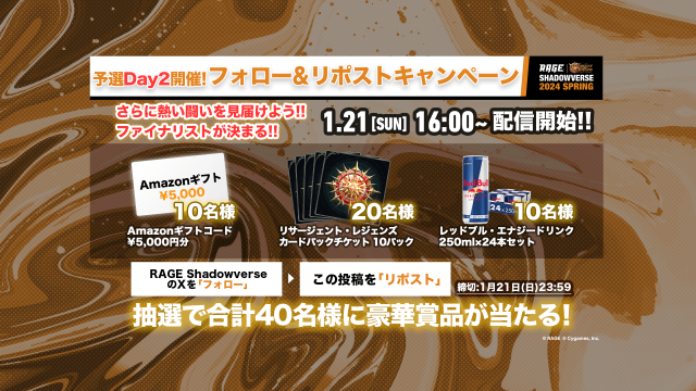 キャンペーンRAGE運営事務局でございます。 「RAGE Shadowverse 2024 Spring」予選大会 Day2 開催を記念してXフォロー&リポストキャンペーンを実施中です。 RAGE Sha...