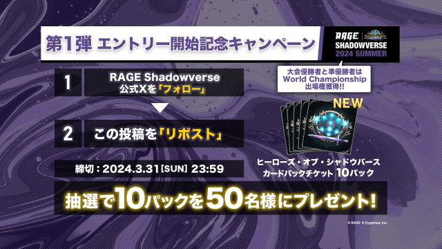 キャンペーンRAGE運営事務局でございます。 「RAGE Shadowverse 2024 Summer」エントリー開始を記念してXフォロー&リポストキャンペーンを実施中です。 RAGE Shadowve...