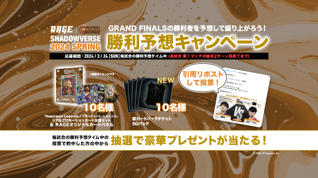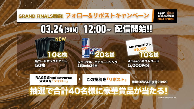 キャンペーンRAGE運営事務局でございます。 「RAGE Shadowverse 2024 Spring」GRAND FINALS 開催を記念してXフォロー&リポストキャンペーンを実施中です。 RAGE ...