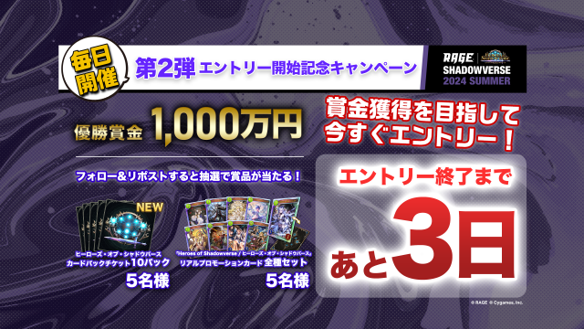 キャンペーンRAGE運営事務局でございます。 「RAGE Shadowverse 2024 Summer」エントリー締め切り直前に、Xフォロー&リポストで商品が当たるカウントダウンキャンペーンを実施中です...