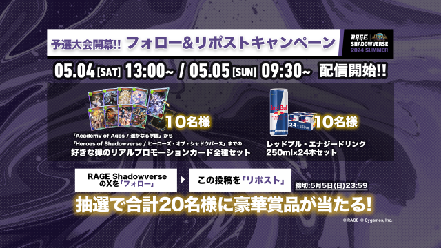 キャンペーンRAGE運営事務局でございます。 「RAGE Shadowverse 2024 Summer」予選大会 開催を記念してXフォロー&リポストキャンペーンを実施中です。 RAGE Shadowve...