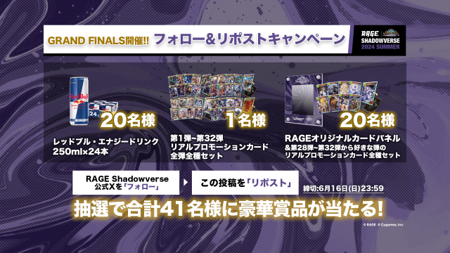 キャンペーンRAGE運営事務局でございます。 「RAGE Shadowverse 2024 Summer」GRAND FINALS 開催を記念してXフォロー&リポストキャンペーンを実施中です。 RAGE ...