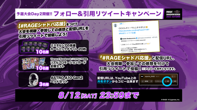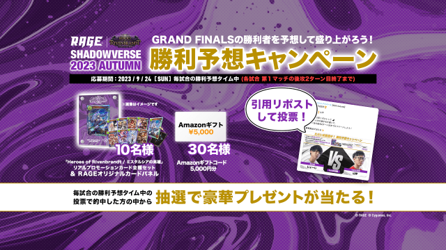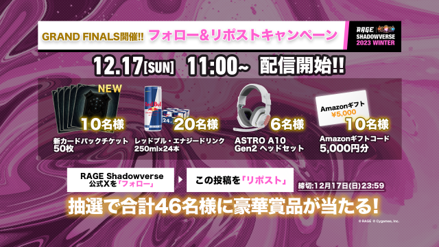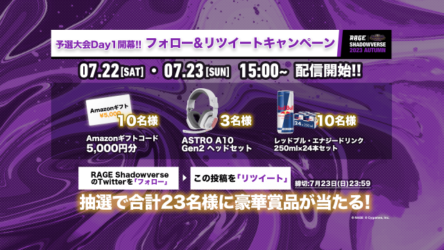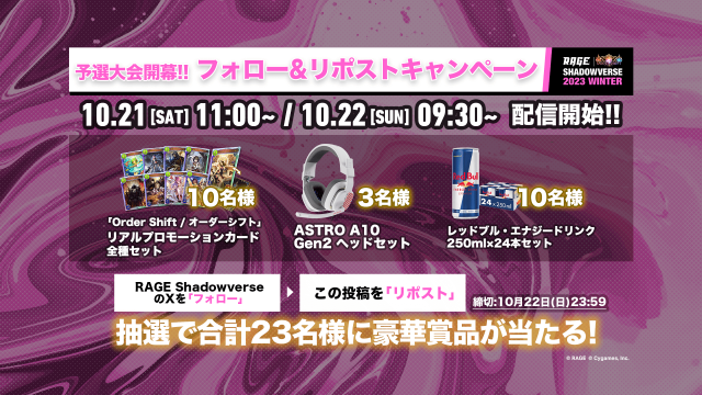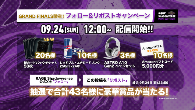 キャンペーンRAGE運営事務局でございます。 「RAGE Shadowverse 2023 Autumn」GRAND FINALS 開催を記念してXフォロー&リポストキャンペーンを実施中です。 RAGE ...