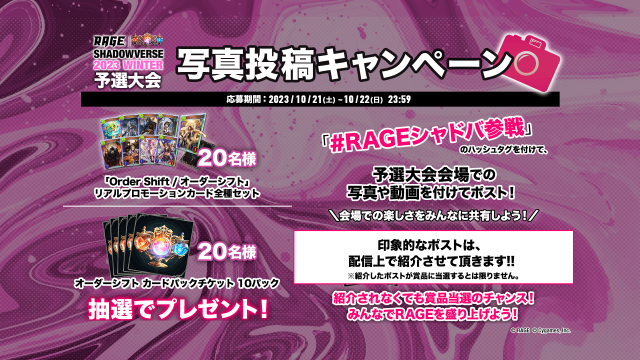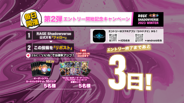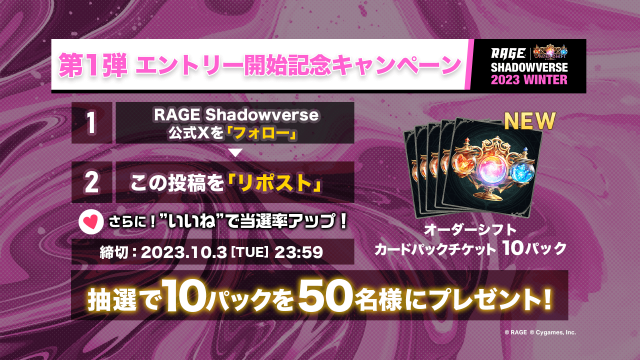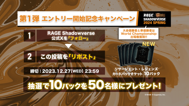 キャンペーンRAGE運営事務局でございます。 「RAGE Shadowverse 2023 Winter」エントリー開始を記念してXフォロー&リポストキャンペーンを実施中です。 RAGE Shadowve...