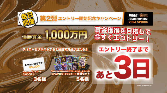 キャンペーンRAGE運営事務局でございます。 「RAGE Shadowverse 2024 Spring」エントリー開始を記念して、Xフォロー&リポストで商品が当たるカウントダウンキャンペーンを実施中です...