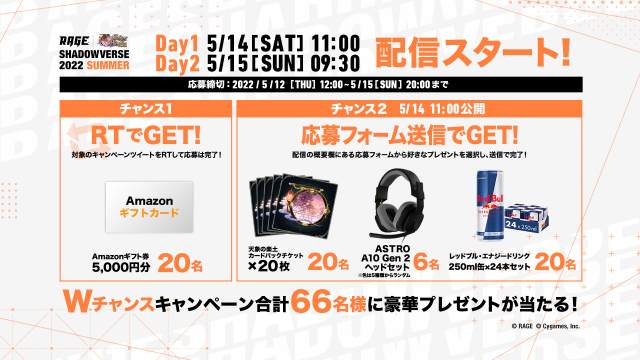キャンペーンRAGE運営事務局でございます。 「RAGE Shadowverse 2022 Summer」エントリー開始を記念いたしまして、第3弾Twitterフォロー&リツイートキャンペーンを実施中です...