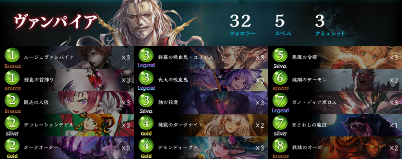 自傷能力(自分のリーダーにダメージを与える能力)を持つカードが大量に採用されており、4から5ターン目に安定して狂乱状態に入ることができるようになったことで、狂乱ヴァンパイアは中盤戦をリードする存在になりました。狂乱状態下ではいずれのカードもコストに見合わない活躍を見せ、特に《ダークエンペラー》に手を焼いたプレイヤーは既に大勢いるのではないでしょうか。中盤戦で十分なリードを作ることができれば、盤面を絡めながらじりじりと相手の体力を詰めていける強力なデッキとなっています。