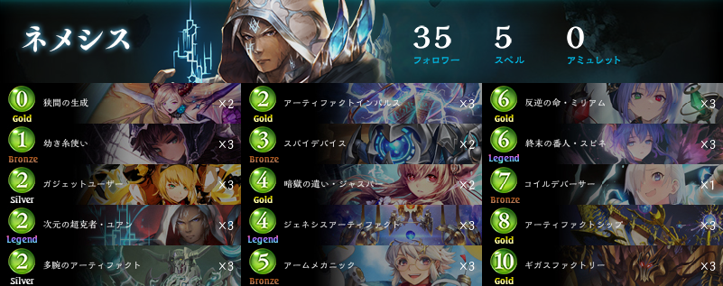 この他、《クロノウィッチ》という新たなフィニッシャーを手に入れたスペルウィッチや、ウィッチ全般に有効な《セレストマグナ》を構えつつローテーション落ちの影響を受けていないラストワードネクロマンサー、《ジェネシスアーティファクト》の登場でより多彩な攻めを実現したアーティファクトネメシスなどが大会での使用率で追随しています。