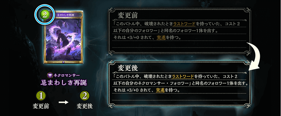 昨年の世界大会で大活躍を見せた進化ネクロマンサーは、新カードの追加を受けて「十禍闘争」環境でも、その初期から猛威を振るいました。上記の能力変更の引き金を引いたデッキだと考えられます。